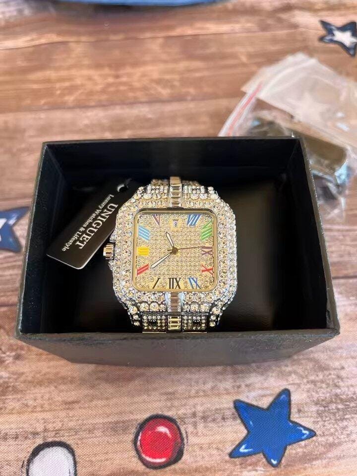 -Diseño Helado y Brillante: Caja y correa de acero inoxidable premium, con incrustaciones de ICE (diseño "iced out" con cristales) que capturan la luz como joyas de hielo, disponibles en plata, dorado y oro rosa. La esfera cuadrada de 42 mm con números romanos añade un toque clásico y elegante.